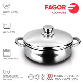 Add to cart. 20cm de diámetro. Acero inoxidable 18/10. Fondo termodifusor de 3 capas. Forma bombeada. Óptima distribución del capor. Tapas y asas en acero inoxidable. Apto para todo tipo de fuegos. Apto para horno<br